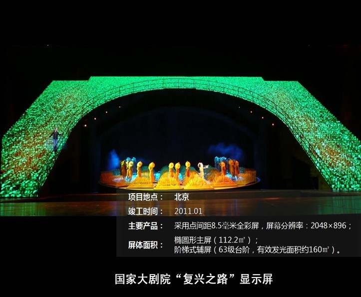 该LED显示屏分为椭圆形主屏和阶梯式辅屏,主屏总面积约112.2平方米,有效发光面积约104.2平方米,分辨率为2048x896像素,点间距8.5毫米,47.5米深的舞台纵深空间全部启用,8米多高的超大巨幕能在几十秒内完全“隐身”;辅屏幕安装在63级台阶上,为台阶立面LED显示屏,有效发光面积约160平方米。该屏是继国庆60周年天安门广场特大LED显示屏工程之后,勤上光电整合国内LED显示屏产业链成功承建的又一重大LED显示屏工程,再次使"东莞制造"的美誉名扬京城。...[详细]