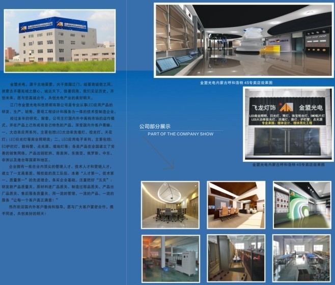 江门市金盟光电科技照明有限公司是专业从事LED应用产品的研发、生产、销售、景观工程设计和服务为 一体的技术型制造企业。