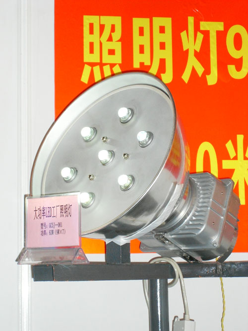 技术特点:该灯是采用新型的半导体光源,具有功率小、高效节能、寿命长的绿色照明产品。 技术规范:符合GB7000.1(灯具的一般安全要求与试验) 应用范围:工厂、广场、仓储、运动场所等。 制作材料:灯罩采用铝合金旋压,灯具电器箱采用压铸铝。 安装方式:灯具可用灯杆吊装、吸壁安装等。 功率:9W×7 输入电压:220v 光源寿命:80000/h 专利号:200720087104.6