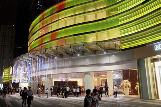 雄踞于天河北路与体育东路交界的“黄金十字路口”,太古汇对面。集高级公寓、写字楼、大型商场于一身。我司承接万菱汇裙楼的室内外照明设计和塔楼的建筑外墙照明设计。裙楼的外墙照明,我们选择了色彩斑斓的LED灯作为主体照明,给人强大的视觉冲击力。