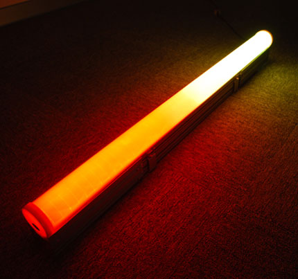 铝合金灯体底座,表面阳极氧化或按照环境背景颜色喷塑处理,配套德国拜尔抗紫外线型PC3103灯管,端盖采用拜尔PC2407注塑,LED光源采用直径5mm封装形式,发光角度为120℃,R、G、B三种颜色光源均布,内置程序控制芯片,可以实现单根多段落全彩变色效果。