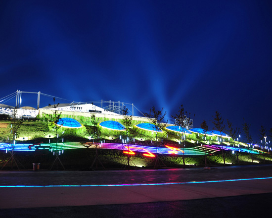 海阳河清岛体育场室外追加夜景照明工程设计与施工项目于2012年4月我公司承接.在整体亚沙体育场照明中,我公司所承接项目为"点晴"之作.主会场的八个主入口通道照明,场地外园景观绿植带照明,火炬塔雕塑照明,淡水湖蝴蝶岛照明等将整个广场夜景完美的展现在人们眼前.