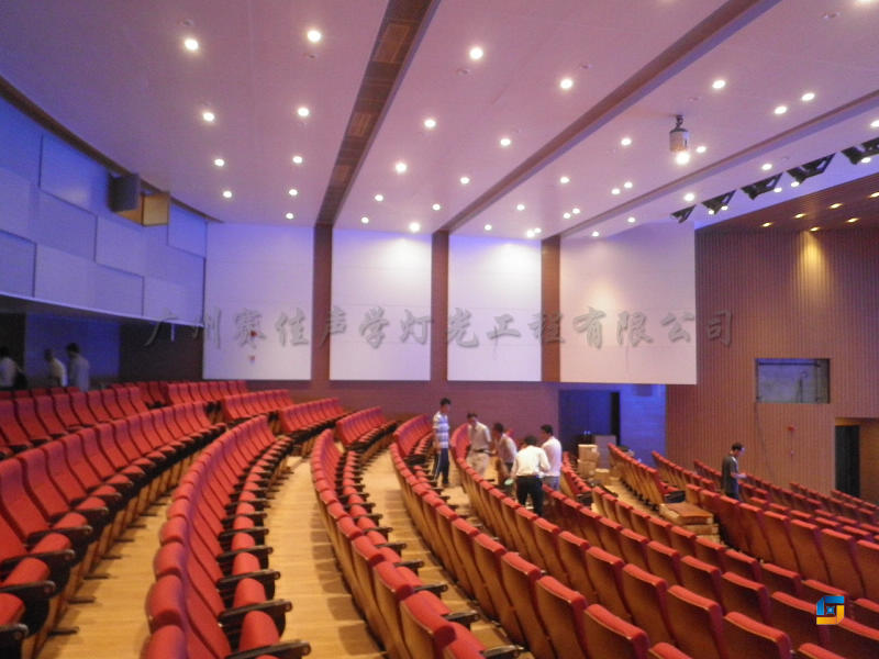 二道效果灯光:每道设置4台1200W电脑摇头灯,共设置10个直通回路;同时在一、二道顶光上方各设置9台1.25KW二次反射柔光灯,做为会议、报告时,舞台区的铺光用。