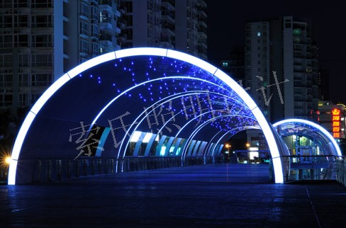 全国首例户外导光板照明案例 在天桥的外立面上,使用导光板镶嵌在天桥环形结构,其颜色与建筑材质一致,将灯具很好的隐蔽起来。虽然是简单的轮廓勾勒,但突出了天桥的神秘感、现代感。从美学的角度上,高光、阴影、线条的巧妙互动,记录下天桥夜景灯光的独特氛围。 整体灯光色调以优雅、时尚、神秘而现代的蓝色来诠释,期间穿插明快的白,其氛围宁静而神秘,强调出光的质感. 每当夜幕降临,华灯初上,天桥的夜景灯光营造出的灯光效果,犹如一艘太空船遨游在浩瀚的太空之中。