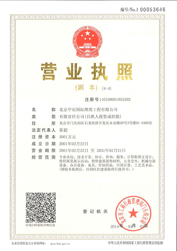 - 经营范围:专门从事城市景观照明,及照明产品代理、安装施工,销售欧美照明产品。