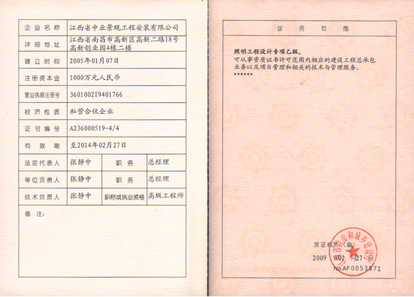 - 经营范围:景观照明工程,城市亮化工程,园林、广场景观亮化工程,河道景观亮化工程,楼宇外墙亮化工程,城市道路景观照明工程,景观照明设计,亮化照明设计,提供照明资质服务