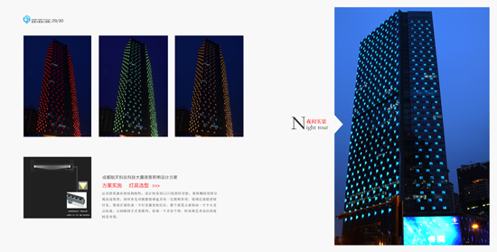 摘要: 简约、时尚、个性 设计方案一主要采用“以点带面”的方式来展现航天科技大厦在夜间的超凡现代主义和极简风格.打造该区域独一无二具有艺术 品位的夜间光环境,提升其夜间形象.展现出航天科技大厦作为超甲级写字楼的品位和个性,使其从周边夜景中脱颖而出,凸显 其“地标”地位。 。[详细]