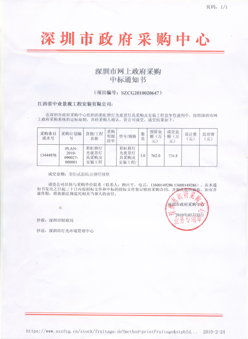 我公司中标深圳彩虹桥灯光夜景灯具采购及安装工程,中标价为762万元。