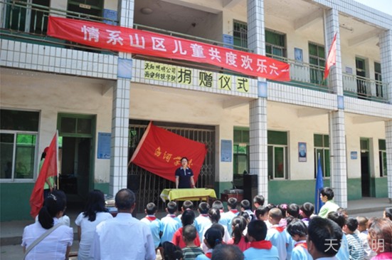 5月30日上午,由西安科技大学青年志愿者中队协助,天和照明公司资助的照明设备爱心捐赠仪式在临潼区斜口镇房河小学举行。