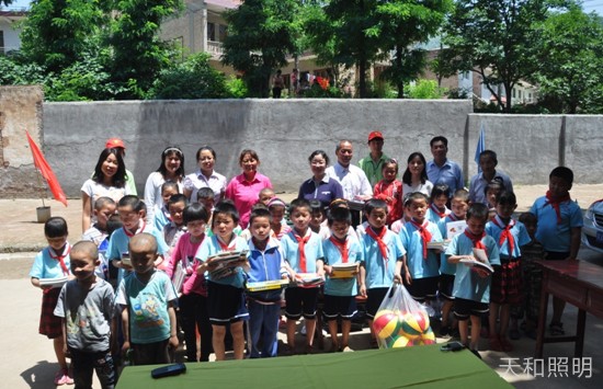 天和照明公司在“六一”节来临之前免费为房河小学的学生教室及教师办公室更换了国内领先的LED照明设备,同时改善了学校校门、走廊、操场的照明设施,用专业的技术回报社会,尽一份社会责任,大大改善了孩子们的照明环境和学习环境。捐赠仪式当天,公司员工代表为孩子们送去了由员工们自发捐赠的课外书籍、学习用品及体育活动用品,丰富孩子们的课余生活。活动现场笑声不断,孩子们真诚地为照明公司员工代表及科大志愿者带上他们心爱的红领巾,表达他们的谢意,载歌载舞与哥哥姐姐叔叔阿姨们欢度自己的节日。整场联谊会歌声与微笑同在,祝福与欢乐同行,充满了孩子们茁壮成长的活泼身影及雏鹰展翅的风采,天和照明公司的爱心也在六一的欢歌中飞扬。