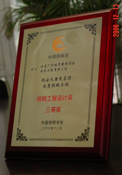 在由中国照明学会设立、中国国家科技奖励办公室正式批准的中照照明奖的首届评选活动中,我公司《西安大唐芙蓉园夜景照明工程》荣获该奖项三等奖。该奖项为中国照明领域唯一的科技奖项,奖项分三大类:即中国照明科技创新奖、中照照明工程设计奖、中照照明教育与学术贡献奖。该奖项的设立是为奖励在国内外照明领域中,在科学研究、技术创新、成果推广应用、实现高新技术产业化、照明工程实施和科普教育方面做出杰出贡献的组织和个人。